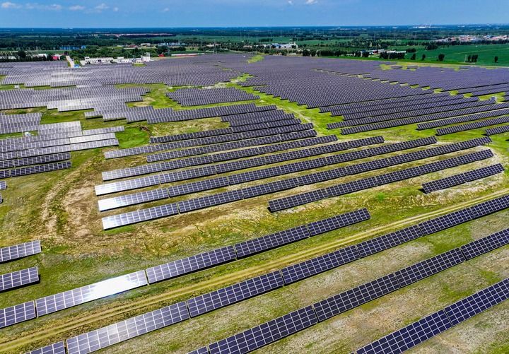 2024年7月19日拍摄的内蒙古通辽发电总厂光伏电站(无人机照片)。新华社记者 连振 摄