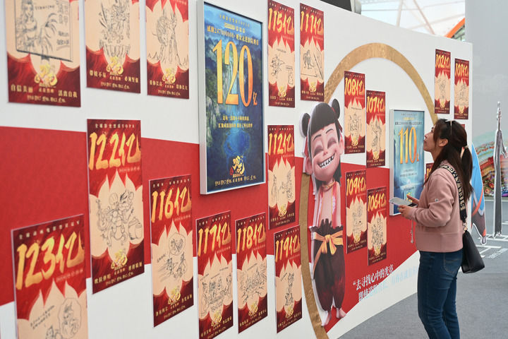 2025年4月19日,观众在电影《哪吒之魔童闹海》手绘海报展上参观。新华社记者 李鑫 摄
